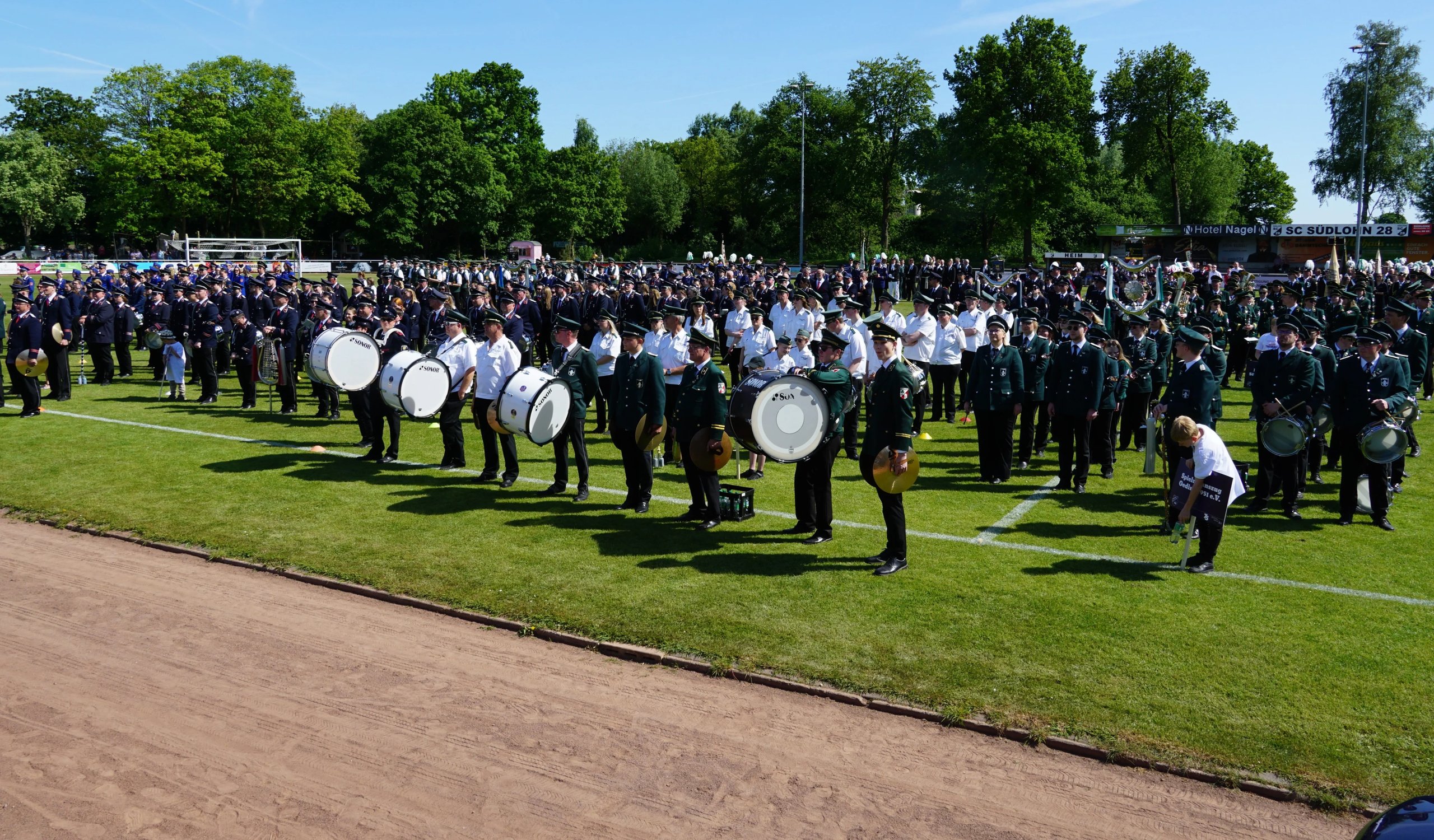 Anschließend zogen alle befreundeten Vereine in einem feierlichen Sternmarsch zum Sportcampus, wo unter anderem das beeindruckendes gemeinsames Spiel aller Musikzüge stattfand.